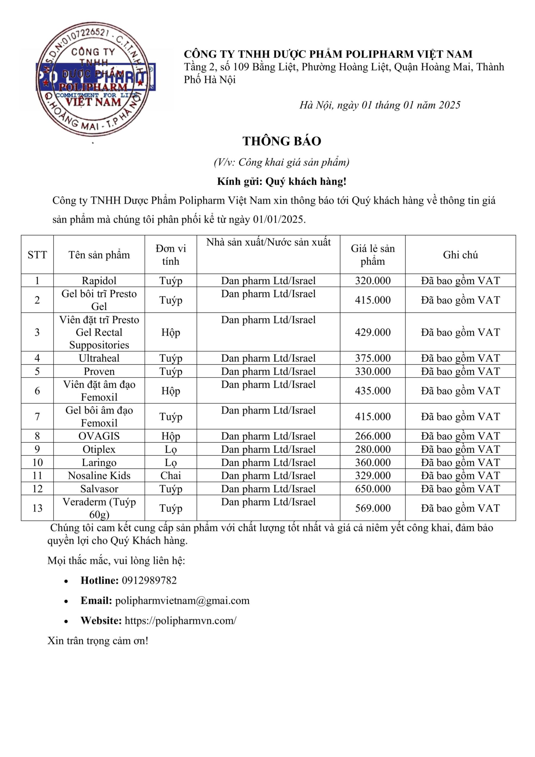 Công ty TNHH Dược Phẩm Polipharm Việt Nam xin gửi đến Quý khách hàng thông báo Công khai giá sản phẩm của công ty chúng tôi từ ngày 01/01/2025 như sau: